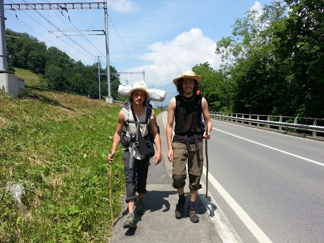 Before we know it we have joined Axel on his walk and agree to walk to the Italian border with him. We receive many gifts including wine, bread and Swiss chocolate! along our way we hear of a Tibetan monastery in a place called Mont Pelerin nearby. We make our way there and are welcomed graciously and given food and a place to sleep for the night as well good company and a chance to explore the beautiful temple. The next day after a morning meditation and a farewell to the monk's we head back down the hill and make our way to the lake again and continue our mini pilgramage. The first couple of days proove to be a real physical test and I have some shoulder pain but after some adjustments with the bag and some more strength it becomes a pleasure once more. along our way we encounter various beautiful landscapes always backed by the mountains which became larger with every kilometre we took. We are surprised to see a couple of snakes on the route and given a treat by nature in the form of wild strawberries. After more than 100km walking for 7 days we arrive at or destination of col du gt st bernard on the italian border at around 2500m altitude. A mesmerising snow capped landscape and an apt place for us to end our walk. We are very kindly given food and accommodation at the monastery and spend a great last evening with axel before he continues tomorrow into Italy and on to Rome. Enjoy my friend and we know you'll receive many gifts along the way!